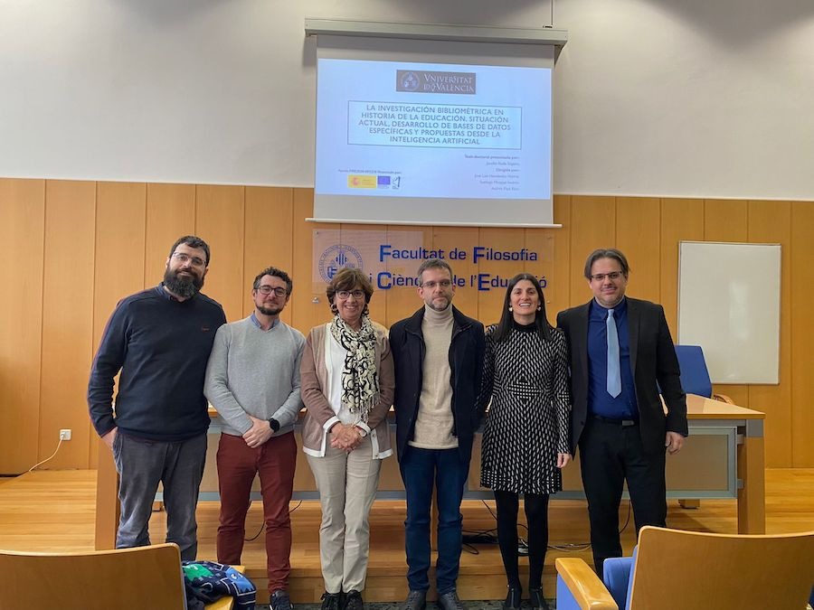 El pasado 20 de febrero tuvo lugar en el Salón de Grados de la Facultad de Filosofía y Ciencias de la Educación (Universidad de Valencia) la lectura de la tesis titulada "La investigación bibliométrica en Historia de la Educación. Situación actual, desarrollo de bases de datos específicas y propuestas desde la inteligencia artificial" elaborada por Jacobo Roda (colaborador del equipo de Connecting History of Education) y dirigida por Santiago Mengual Andrés, también miembro del equipo, y los investigadores principales Andrés Payà Rico y José Luis Herández Huerta.